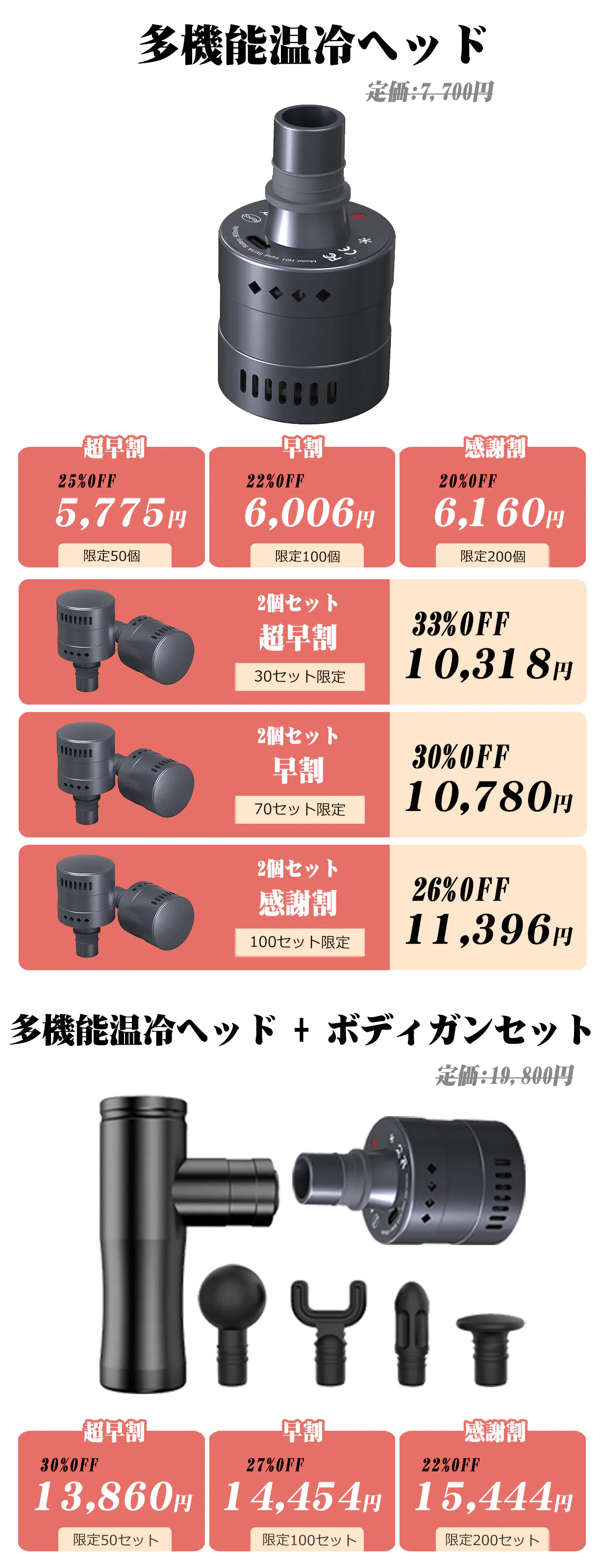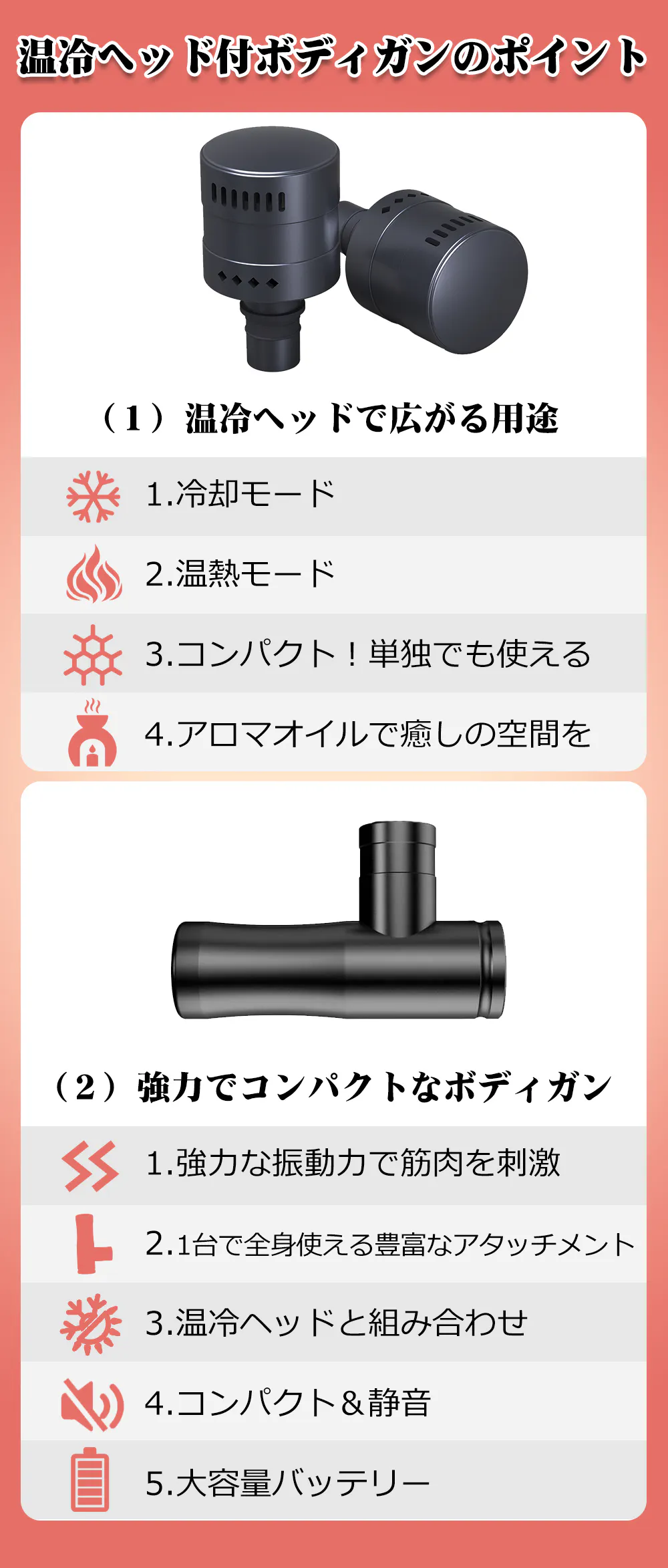 温冷ヘッドとボディガンを組み合わ得て使ば温冷効果と筋肉刺激効果をダブルで享受いただけます。