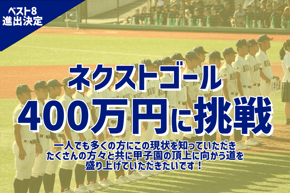 2023/08/17 12:00八戸学院光星は栃木県代表・文星芸大付属高校に6対3で勝利し、ベスト8進出を決めました。たくさんのご声援、本当にありがとうございました。次の試合は、8月19日(土)第2試合10:35から行われます。対戦相手は、茨城県代表・土浦日大です。ベスト4進出をかけた大切な試合となります。また、滞在期間の長期化により、資金面で苦慮しております。現在、ネクストゴールを設定し、目標金額400万円を目指して挑戦することにいたしました。今回のクラウドファンディングは学校としても初めての取り組みで、とても大きな目標になっておりますが、球児たちや応援生徒が甲子園でより良い時間を過ごせるよう、支援体制を整えていければと思っております。ご支援、そしてSNSでのシェアや知人へのシェアが追い風となりますので、ぜひお力添えをいただけますと幸いです。何卒よろしくお願いいたします。 もっと見る台風7号の接近に伴い悪天候が予想されるため、次の試合が16日に順延となりました