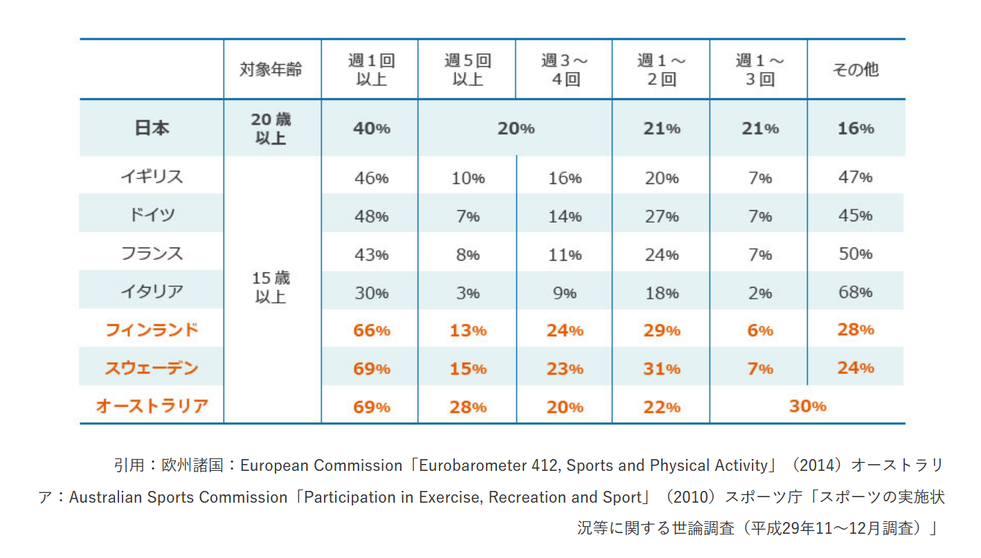 そこでは日本よりも運動することがもっと一般的で、沢山の人が身体を動かす事でキラキラしたアクティブな生活を営んでいるように見えました。(実際、世界のスポーツ実施率は欧米圏と比較し、日本はかなり低い。下図参照)