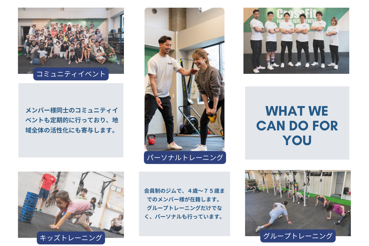 CrossFitは非常に良いトレーニングメソッドで、我々もそれを運用・応用するノウハウを持っています。しかし、まだまだ敷居が高く感じられることも多く、参入障壁となる事象も多いです。