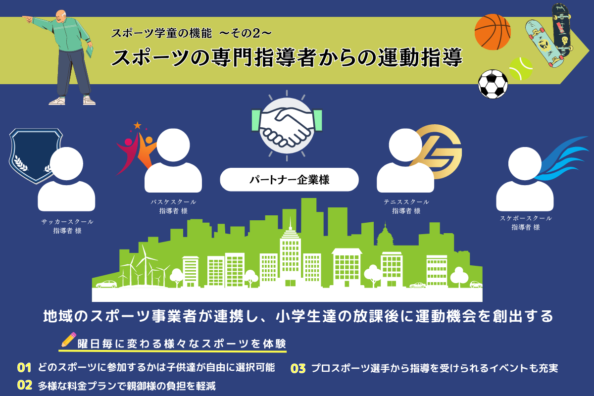 地域の小学生、共働きの親御さん、地域のスポーツ施設様にとって嬉しい3つの特徴があります。