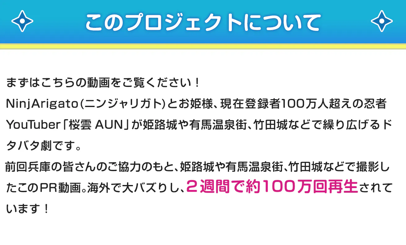 NinjArigato(ニンジャリガト)を日本一の「日本の魅力発信PRキャラクター」にしたい! ローカルな魅力を地元から盛り上げて世界に発信したい! 前回私たちが『完全手出し』で作り上げた第1弾動画はなんと、海外で 100 万再生の大バズり。 その第2弾として、福岡のPR動画を作成したいのです。
