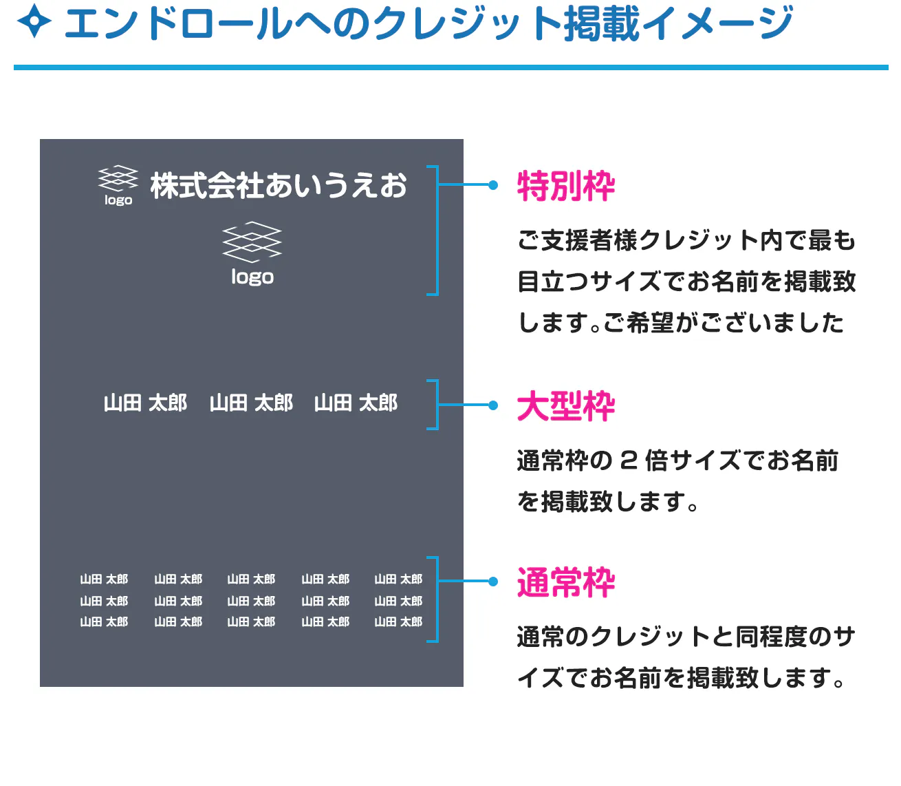 ※ 《 特別枠 》で法人ロゴの掲載をご希望される場合は、その旨も合わせて備考欄へご記入下さい。ロゴのみの掲載も、法人名のテキストとの併記も可能です。(上記「エンドロールへのクレジット掲載イメージ」をご参照下さい)ロゴのデータについては、支援募集期間終了後にCAMPFIRE内メッセージ、またはメールにてお受け取り致します。