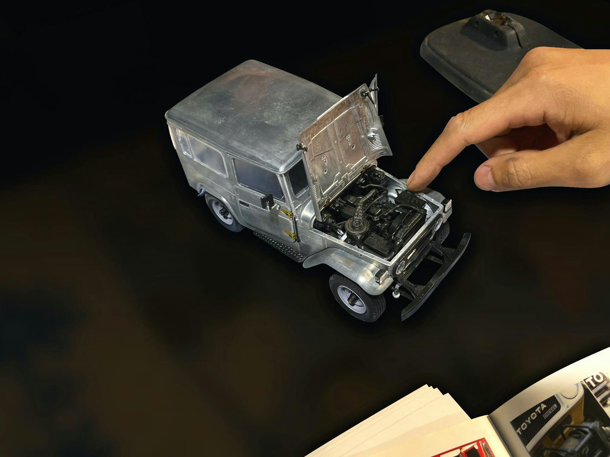 ↑ボンネットも開閉可能。ワイルドな走りを想起させる「B型ディーゼル」搭載のエンジンルームが覗く。※画像はイメージ(ランドクルーザー“60”・1/18スケール)