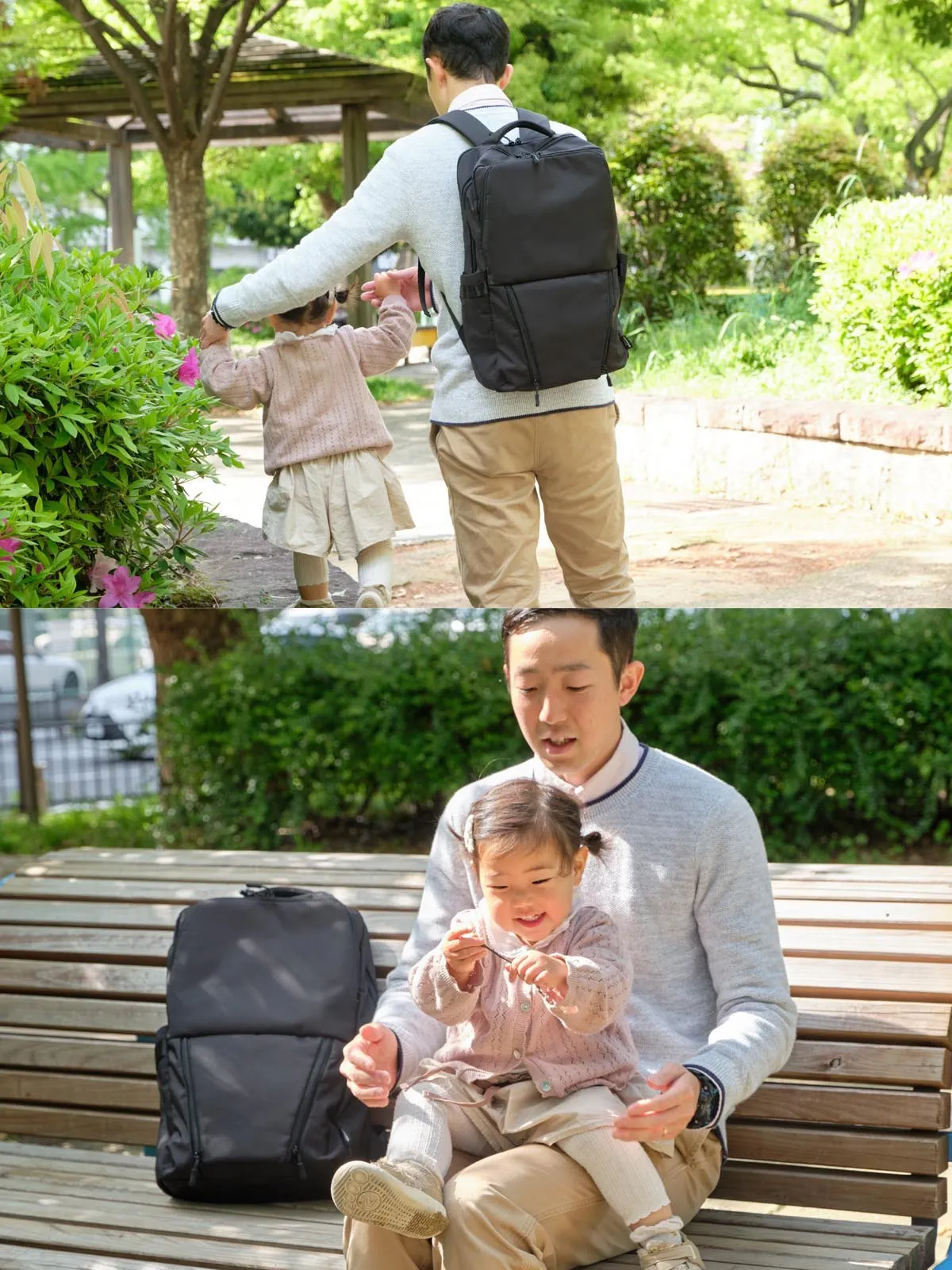 多様性の時代。仕事と家族「時間の両立」を以前より求められるように感じます。そのどちらの時間にも合わせた収納を変え備えたバッグを目指しました。仕事でも使えるデザイン。仕事を支えるPCやガジェトが整理整頓ができる。仕事が終わって保育園まで送り迎えや、公園までちょっと散歩で必要になる子供の必需品。そんなオンオフ兼用で対応できるマルチバッグ。それがKABGAのファザーズバッグ:KABAG father’sです。