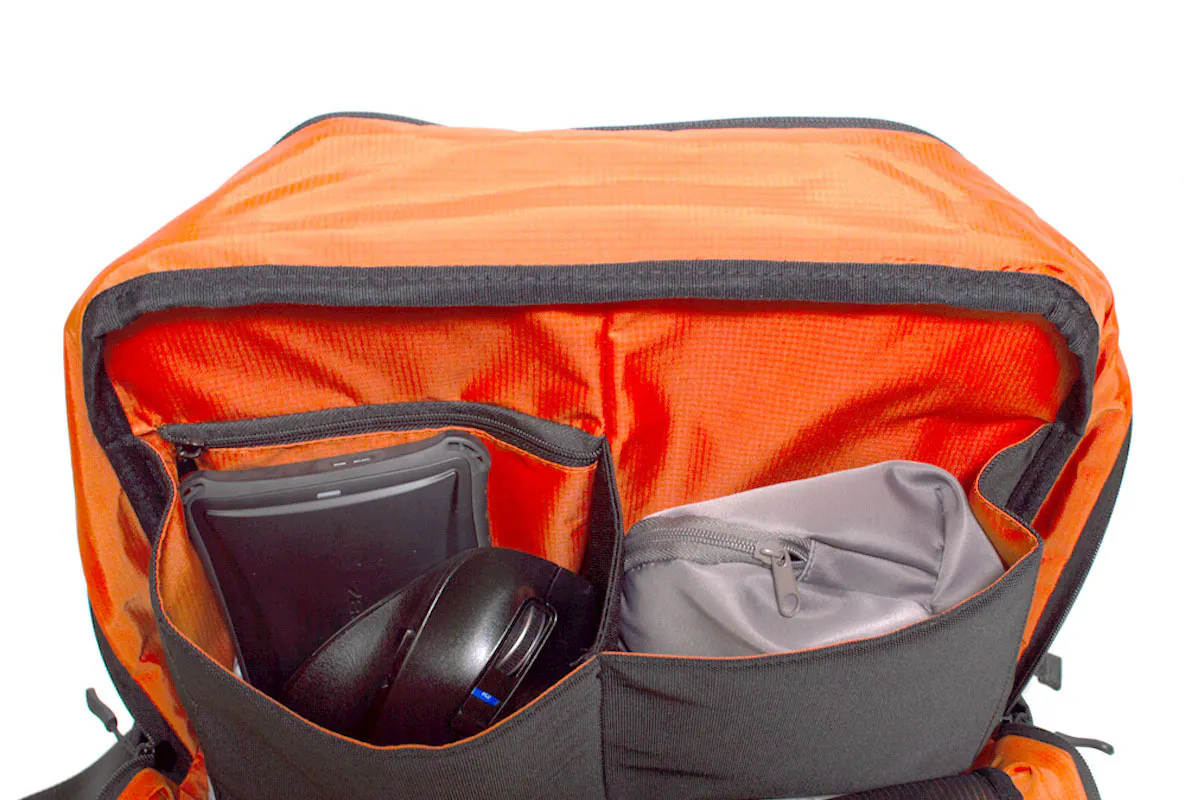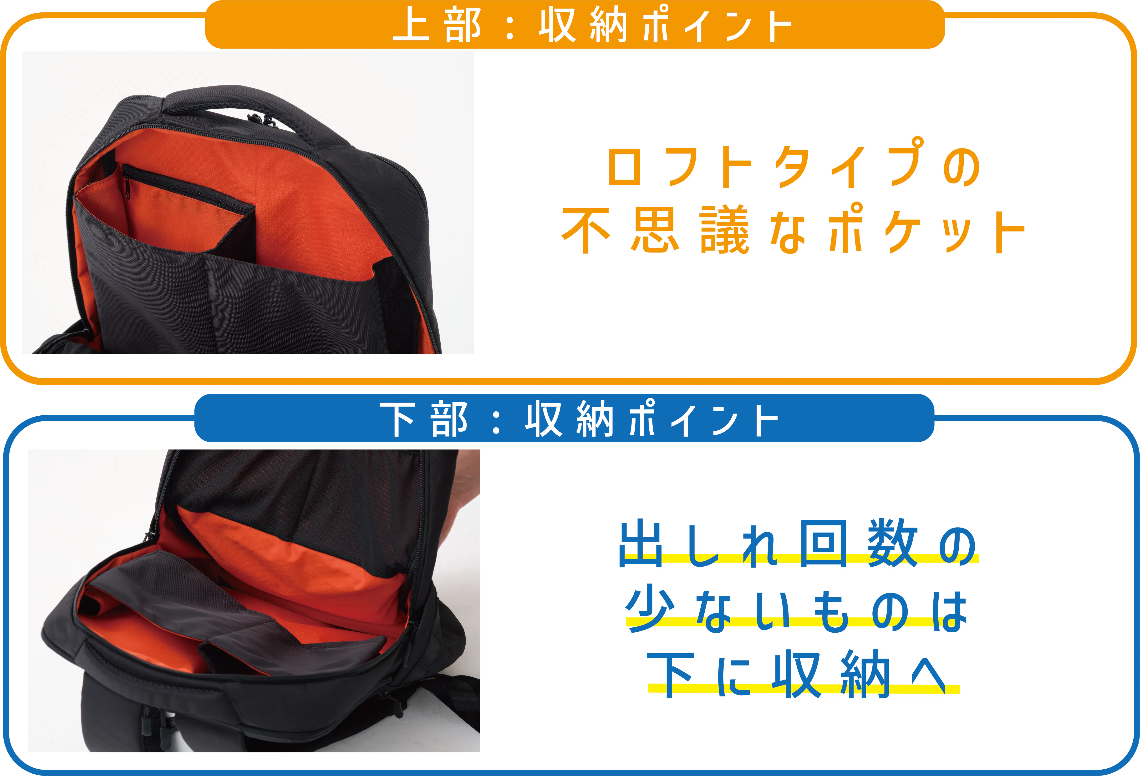 頻繁に出し入れするのものは、すぐに手に取れるようにロフトタイプのオープンポケット。使わないときは畳んで使えます。下の部分にはアダプターや頻度の低いものを入れておくと便利です。