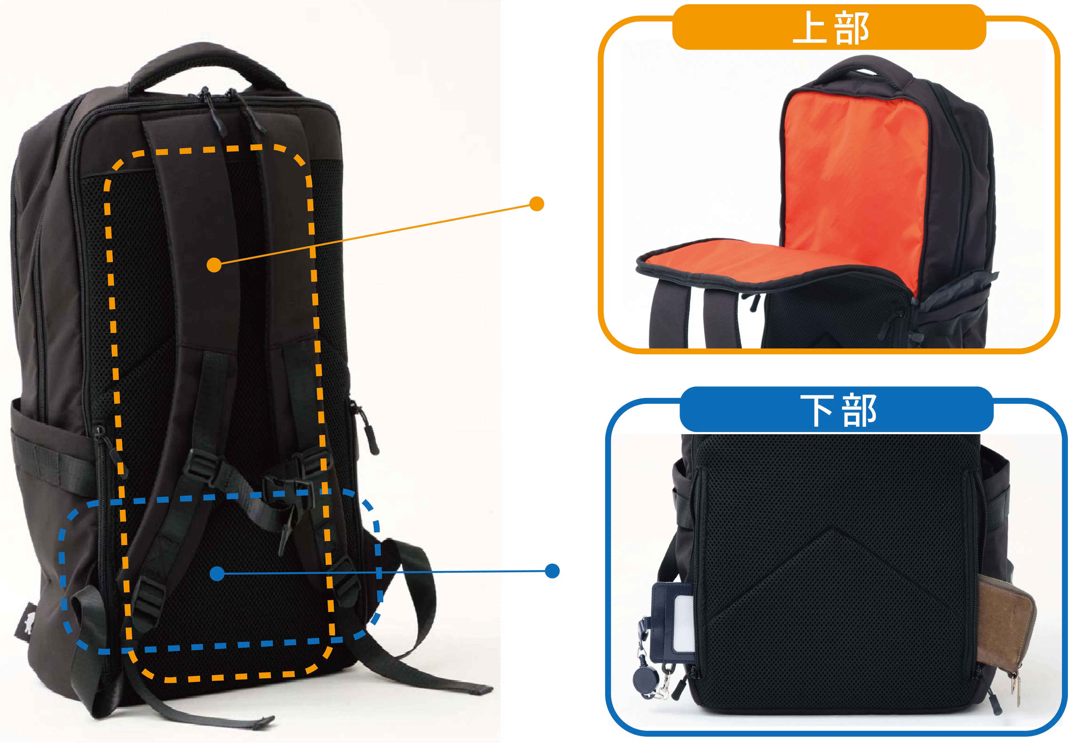また、長時間背負っても疲れないよう、背中や肩、持ち手には柔らかなクッション性を加えています。