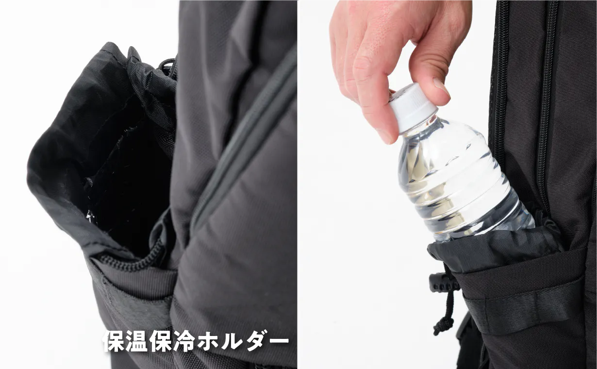 左右にはペットボトルが収納できるポケット※左側には500mlのペットボトルが入る保温保冷仕様になっています。