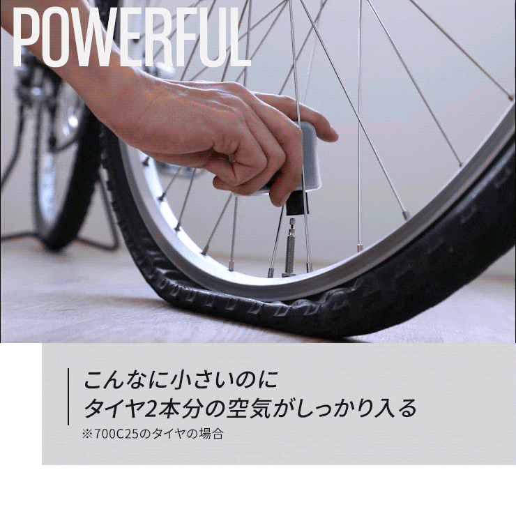 ・小さくてもパワフル!タイヤ2本分の空気がしっかり入る! ※タイヤサイズ 700C25の場合