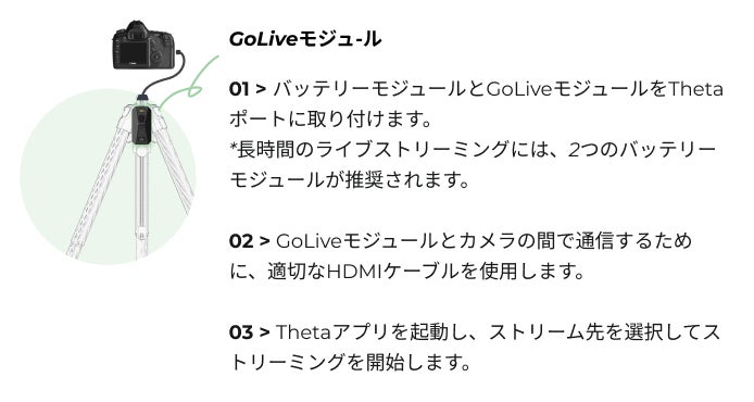 Thetaのカメラコントロールモジュールを使用すると、最大45m離れた場所からカメラを制御できます。シャッタースピードや絞り、ISOの設定が可能で、ライブプレビューにアクセスできます。また、スマートフォンを使ってビデオ撮影や写真撮影の操作をすることもできます。