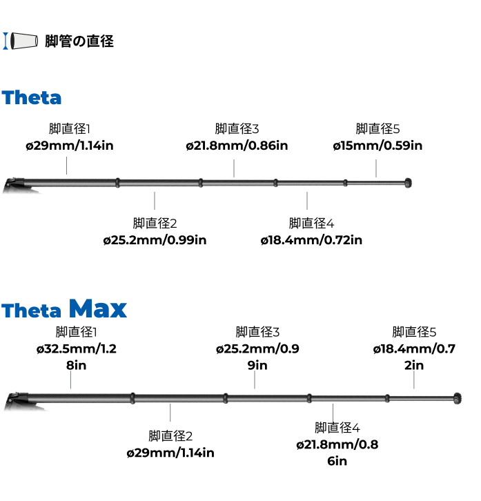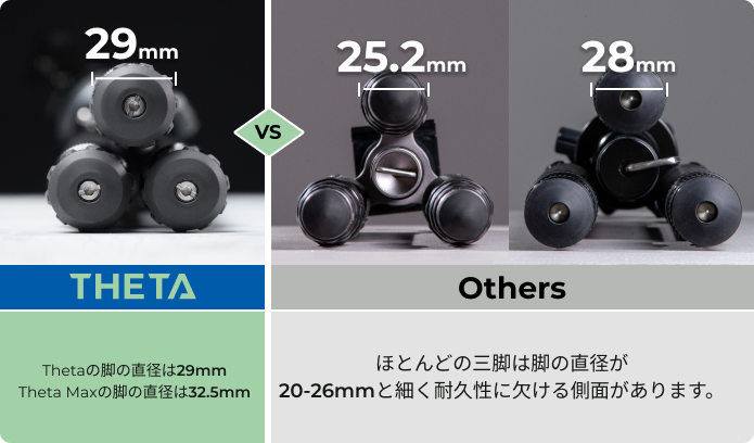 より強固な安定性を実現するために、さまざまな方法を検討しました。その結果、Thetaの脚の直径を増やすことに決めました。これにより、軽量性とコンパクトさを損なわずに、頑丈さを向上させております。