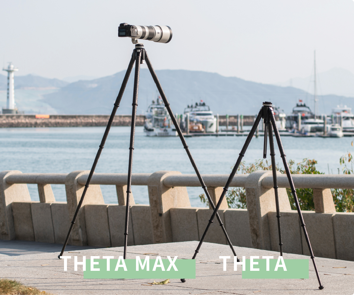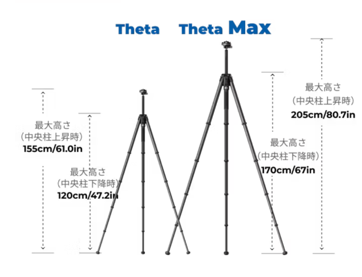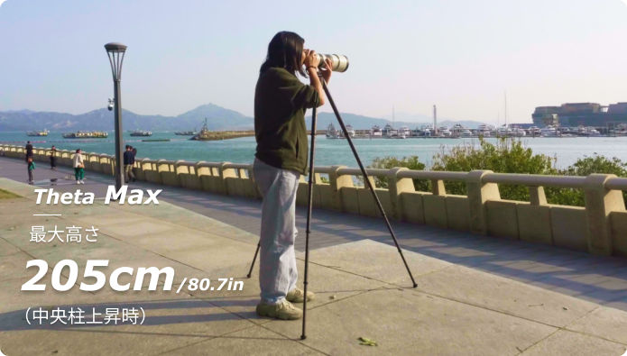 Theta Maxは205cmの高さまで伸ばすことができ、障害物を越えて撮影する際に安定性を保ちます。また、目線の高さに合わせることで、しゃがまずに撮影することができます。