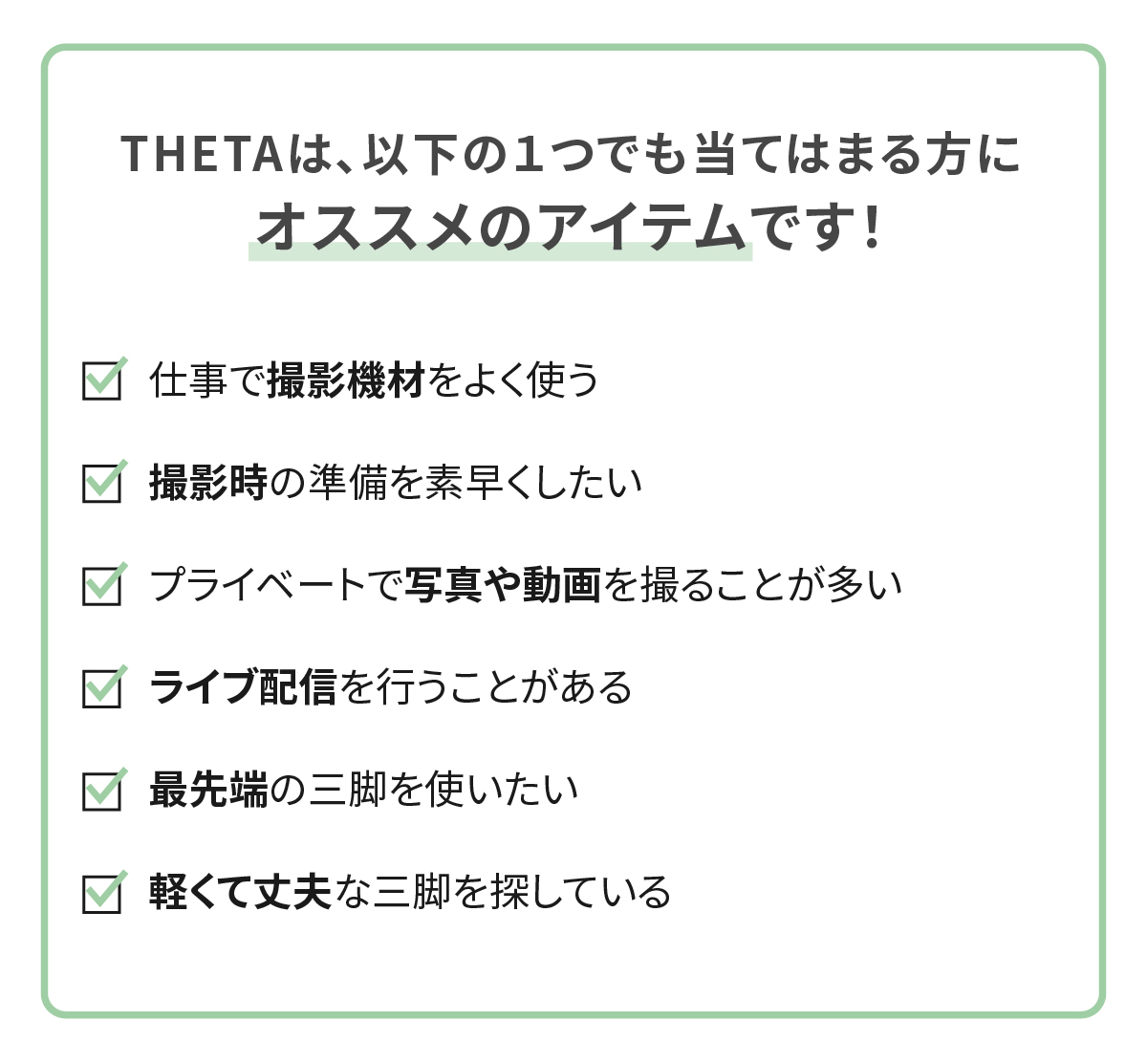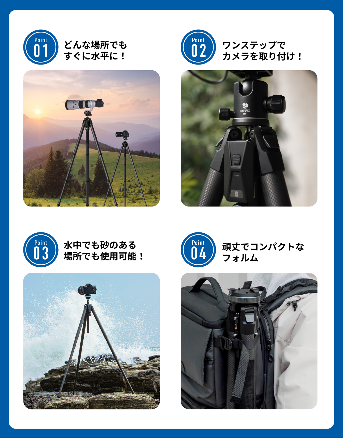 テクノロジーの進化により、私たちは少ない機械やアプリでより多くのことを実現する未来に向かっています。Benro Thetaもその例外ではありません。Thetaは携帯性、安定性、効率性を合わせ持つ製品です。通常の三脚と同じ安定性を提供しながら、迅速な脚の展開、オートレベリング、リモートカメラ制御、自動露出調整、ライブストリーミングなど、写真家が簡単に完璧なショットを撮るための機能が充実しています。Thetaはあなたの旅の写真の質をより高めてくれます。