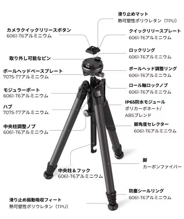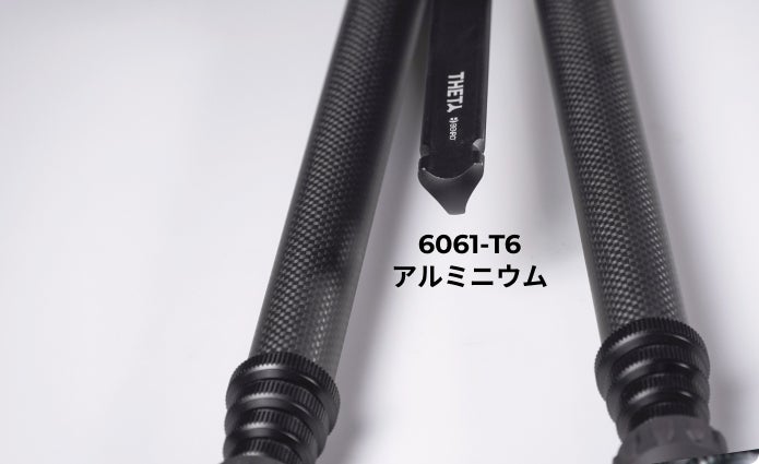 Thetaの中央カラムは、円管の強度を保ちながら、完璧にシームレスにフィットするように形状が調整されています。また、中央カラムは6061-T6アルミニウムで製造されており、さらに強化されています。この設計により、三脚の安定性と耐久性が向上しています。
