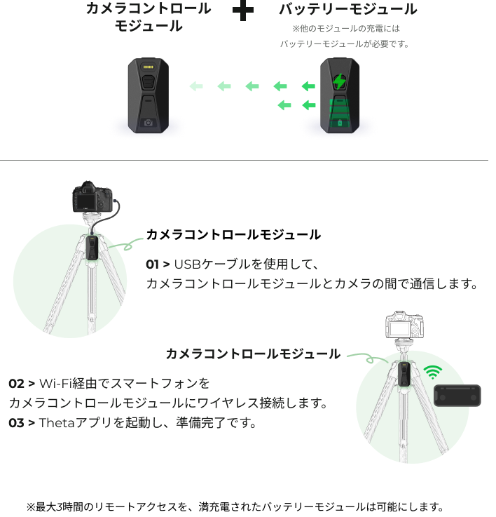 他のThetaモジュールがポートに取り付けられている場合、バッテリーモジュールはそれらに自動的に電力を供給します。ケーブルは必要ありません。