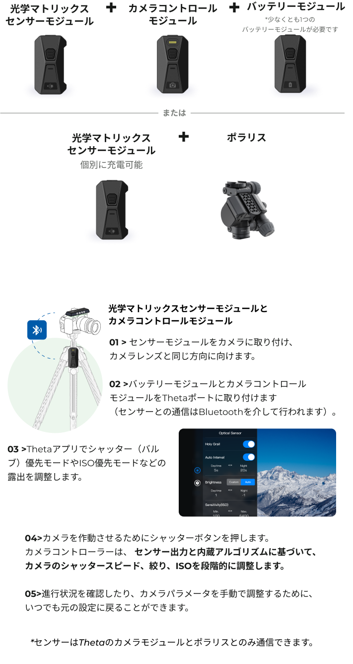 光学マトリックスセンサーモジュールは、タイムラプス撮影に最適なアシスタントです。このモジュールは周囲の光をリアルタイムで検出し、カメラコントロールモジュールがセンサー入力と高度なアルゴリズムを組み合わせて露出設定を自動で調整します。これにより、昼から夜(またはその逆)の移行がスムーズに行えます。