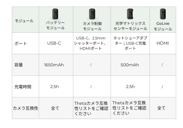 光学マトリックスセンサーモジュールには、内蔵バッテリーがあります。USBケーブルで個別に充電することが可能です。また、Thetaポートに取り付けてバッテリーモジュールを介して充電することもできます。