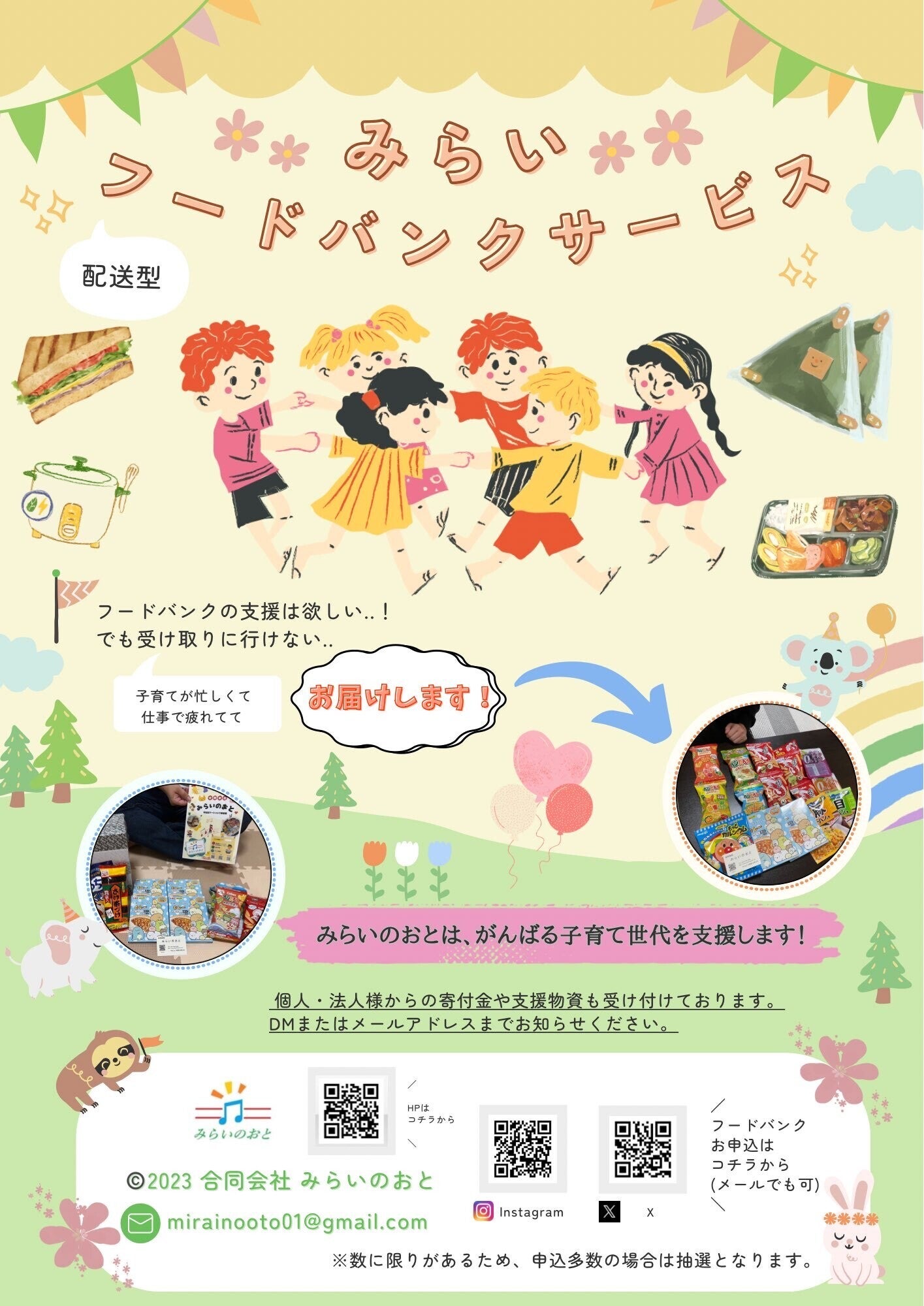 合同会社みらいのおとでは、事業の一つとしてフードバンクサービスを行うことにより、特に子育て世帯への支援を充実させ、「少なくとも食べるものには困らない」「だから明日も頑張れる!」各ご家庭がそう思えるような環境をつくりだす事を目的としています。