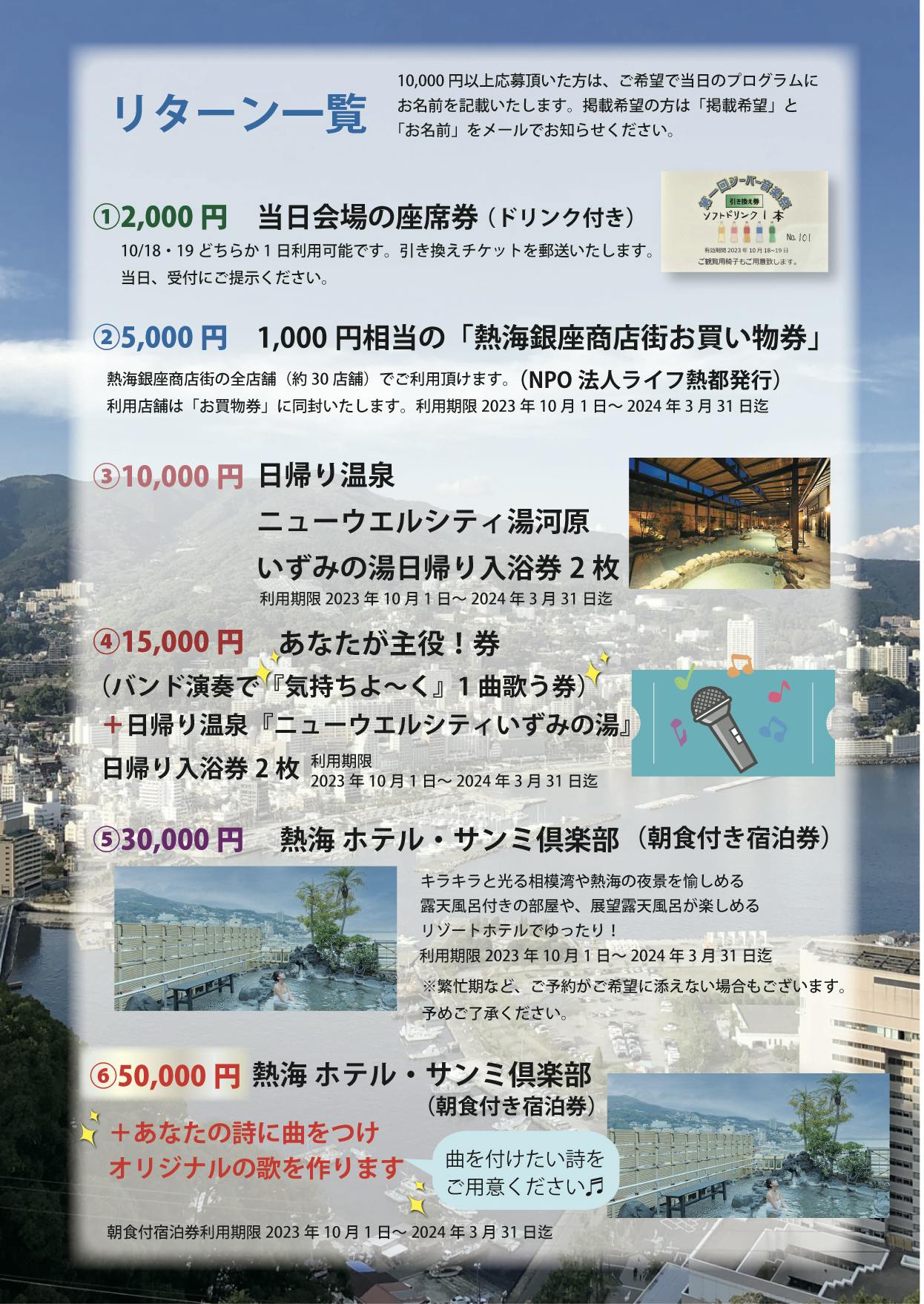 後援 熱海市、一般社団法人熱海市観光協会、熱海市社会福祉協会、熱海温泉旅館協同組合、網代温泉観光協会。