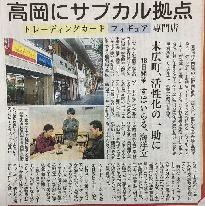 私たち「㈱高岡サブカルチャーズ」は地域の活性化を目指して令和4年3月18日に富山県高岡市の中心市街地である高岡駅から徒歩5分の場所に「カードショップ高岡すぱいらる・フィギュアショップ海洋堂テリア」という店舗をオープンしました。