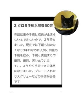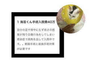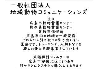 帰りには保健所収容の猫たちを10数匹連れて帰ってくださいました。その後も圧迫排尿が必要な犬猫、殺処分候補の犬、里親が見つかり難い土佐犬や野犬たちと、私達一般ボランティアが手に負えない犬猫たちを引き受けてくださるボランティア団体のボランティア的存在です。大久保さんとのご縁が無かったら消えていた命はたくさんあります。妥協することなく医療もトレーニングにもかなりの費用をかけて下さいます。保護活動において私たちが苦慮することは資金です。みなさまの応援が活動の支えです。ご支援のご協力をよろしくお願い致します。」