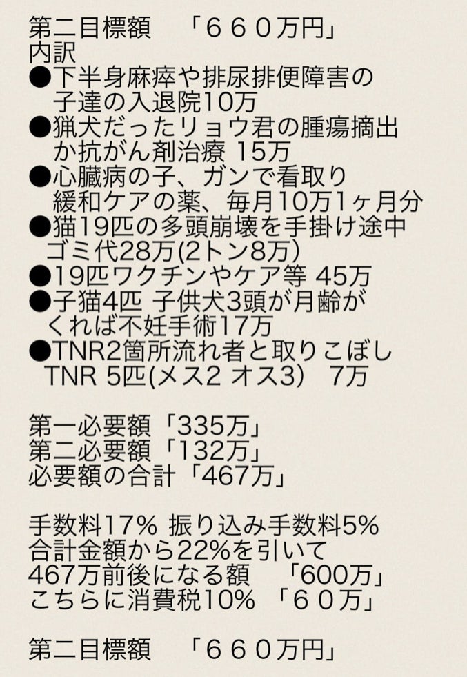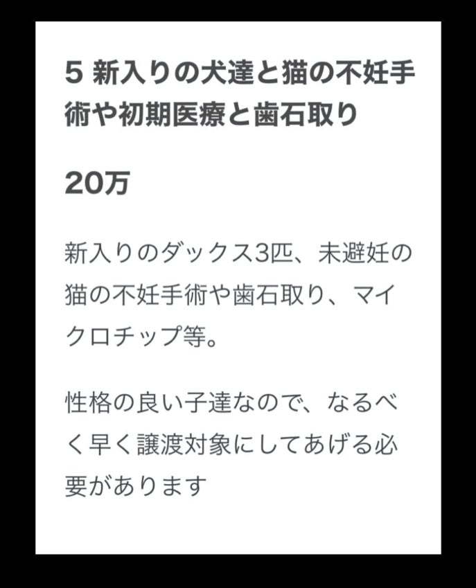 2024/08/19 20:13人手不足で大変だった当会ですがようやく人が増え落ち着きを取り戻しております♪ちょうど10月末に決済で税理士さんのほうでして頂くので、決済が終わりましたら税理士からの決済報告書を貼らさせて頂きますのでお待ち頂けると幸いです悲しい別れ嬉しい別れ頑張ってる子達相変わらずではありますが皆様のおかげで活動できていますまだまだ寄付頼みの当会ですが皆様の負担を減らしていけるようペットホテルなどの運営もスタートしております応援くださる皆様には本当、感謝しかありませんありがとうございます(^人^) もっと見る