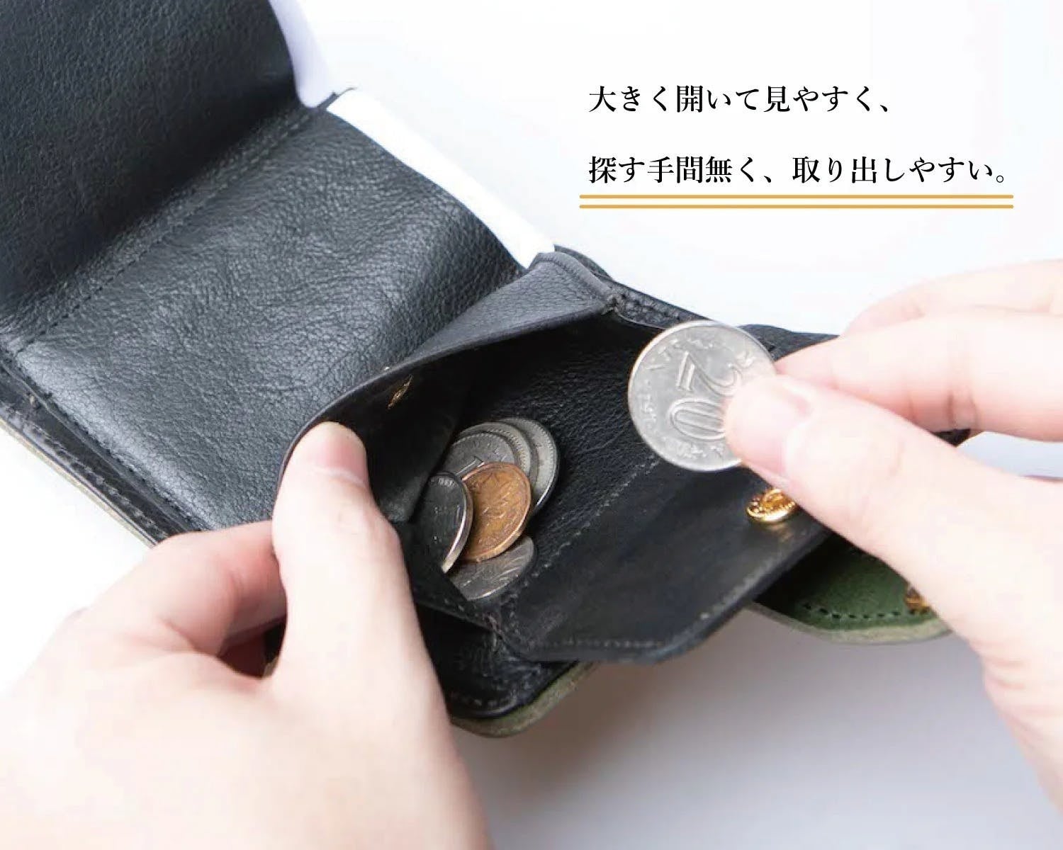 財布を開くと見渡しやすいマチ付きのコインポケットが手元に。