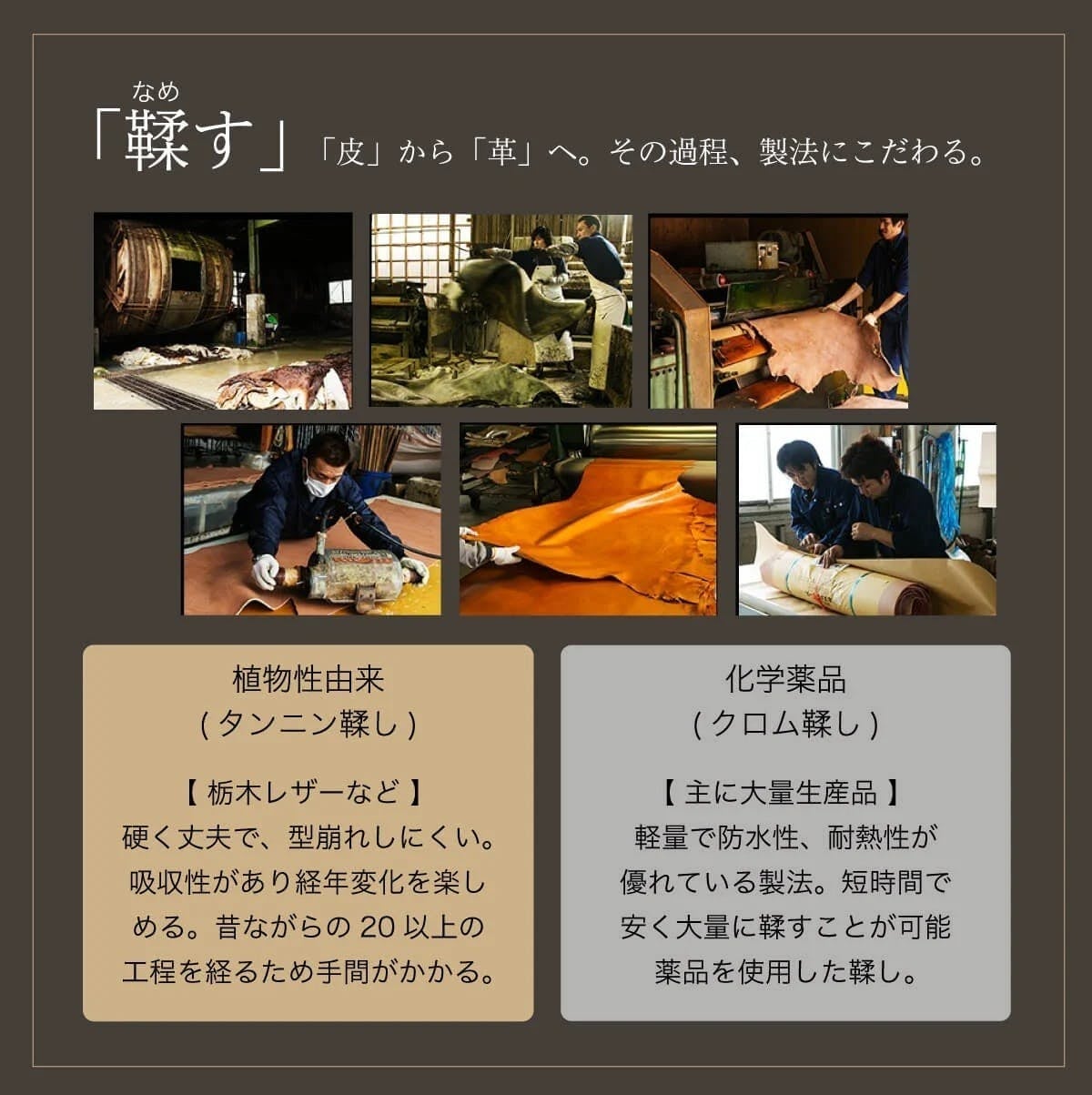 しなやかで堅牢、そして年月を重ねるごとに味わい深く変化していく栃木レザーは、世界中で評価されています。最高峰の品質を誇るレザーを製造するタンナーこそが、この栃木レザーです。