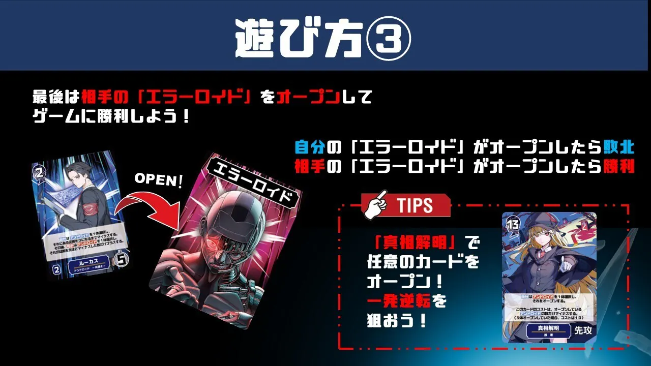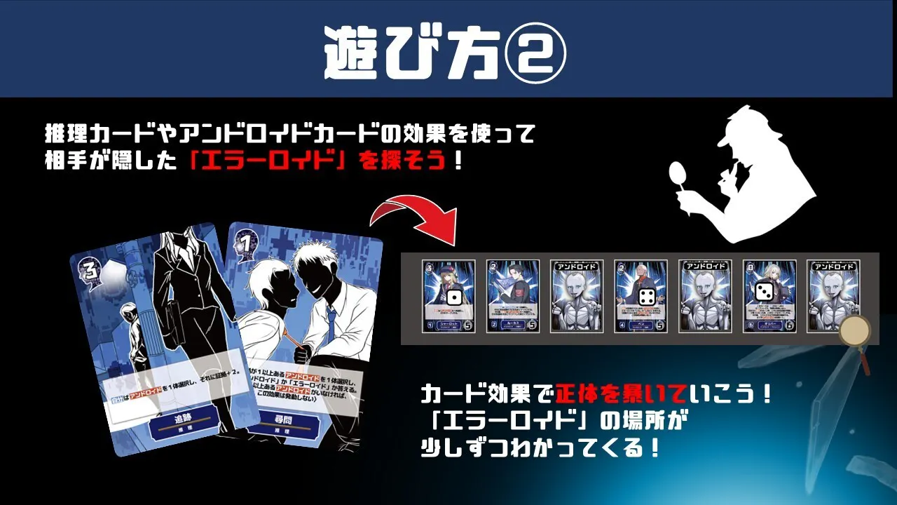 カード効果を駆使し、お互いが隠した「エラーロイド」を探し当て、正体を暴いていく、