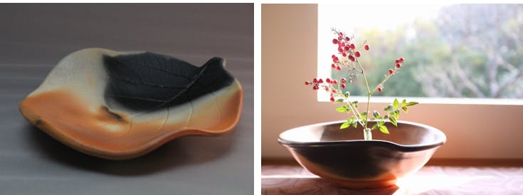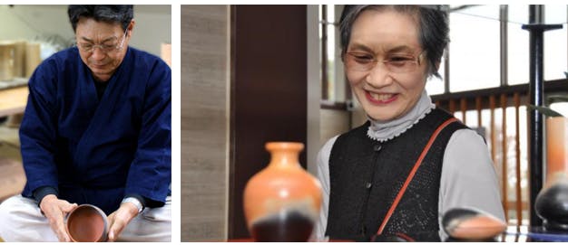 雲火焼は江戸時代後期に大嶋黄谷が赤穂の地において生み出した独特の焼き物です。無釉でありながら陶器は鈍い光沢を呈し、焼くときの炎と煙が窯の中で色彩と文様を形付け、焼きあがった器は燃える夕焼け空を連想され、当時は大人気を博したと言われています。しかし、大嶋のあとは後継者もなく、途絶えることとなります。雲火焼を赤穂で復活させたのが、桃井ミュージアムの桃井香子さんと長棟州彦です。