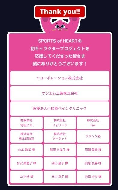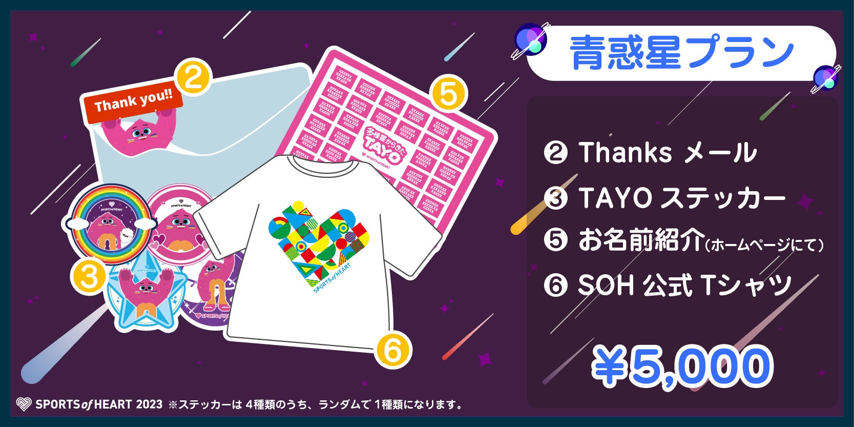 2024/01/30 17:04SPORTS of HEART キャラクタープロジェクトのリターンで「お名前掲載」をお選び頂きました皆様を公式サイト内「TAYOのプロジェクト」で掲載をさせていただきました。https://s-heart.org/tayo#project現在もX「タヨ(多様星からきたTAYO)」では定期的にタヨがコメントを発信しています♪TAYOの可愛いイラスト&コメントをチエックしてください!また、現在「SPORTS of HEART2024」の開催の準備中です。詳細など決まりましたら公式サイト内で発表しますので、引き続き応援のほどよろしくお願いいたします♪https://s-heart.org/about#program もっと見る