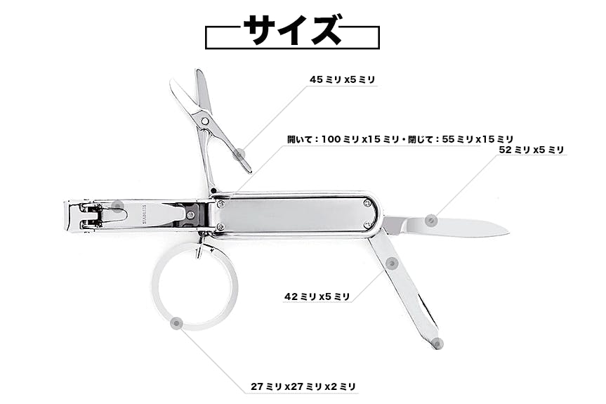 ツール・ド・ネイルのハサミの長さは45ミリ、ナイフの長さは52ミリですので、このどちらの条件に当てはまりますので、問