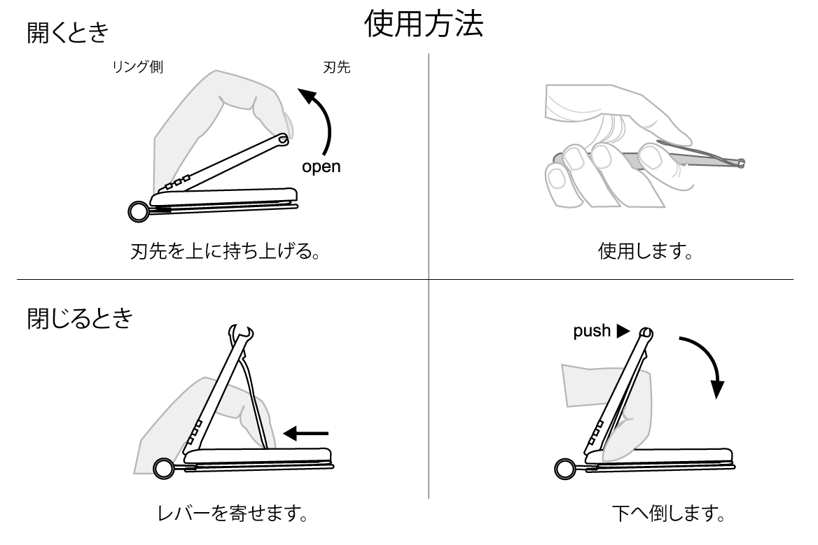 開くときは爪を刃先に差し込み、そのまま持ち上げます。