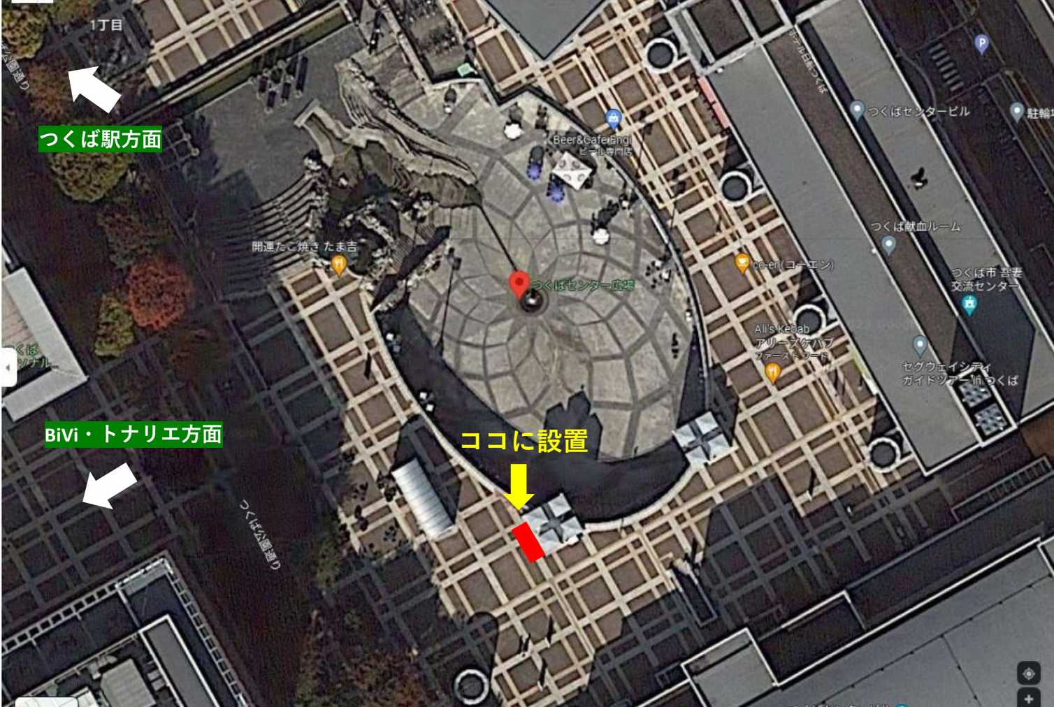 自動販売機を設置しているのは、つくばエクスプレス(TX)つくば駅から徒歩3分の、つくばセンター広場ペディストリアンデッキです。