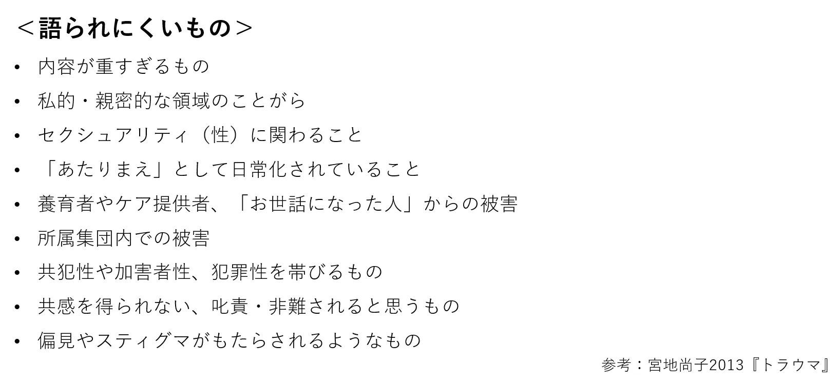 また、こうした体験はときに傷つき体験として“トラウマ”となり、語られにくいものとして知られています。