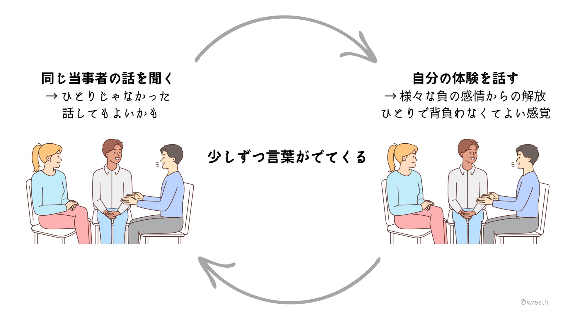 しかし、同じような体験をした当事者の集まりであるセルフヘルプグループでは、少しずつ言葉がでてくる可能性を秘めています。