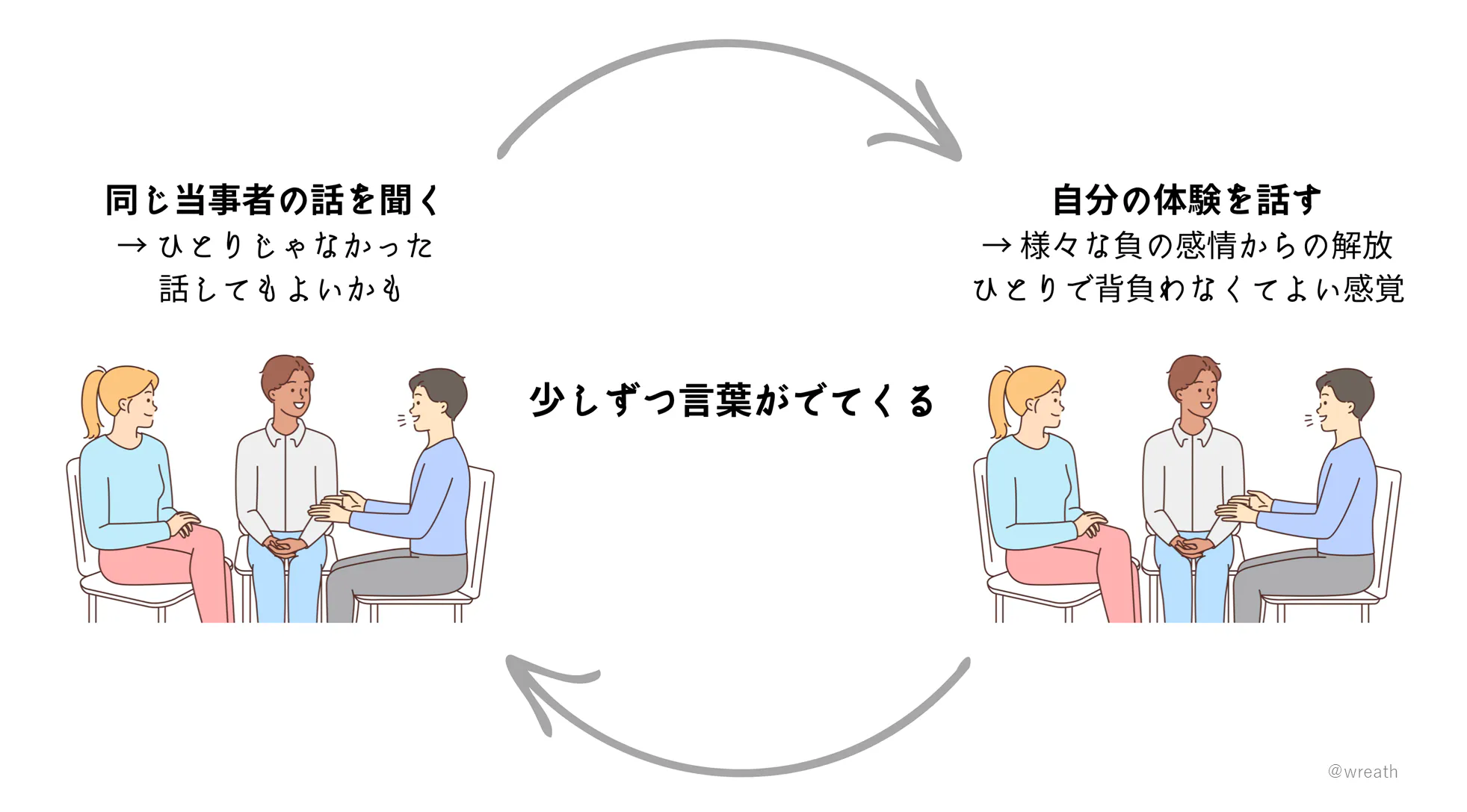 そうしてセルフヘルプグループのなかで体験を話したり聞いたりするなかで、自分の傷つき体験を言語化できるようになることがあります。
