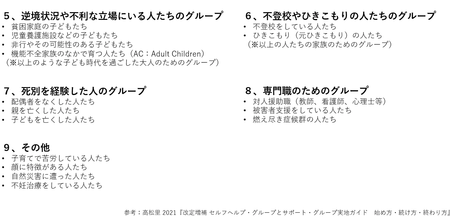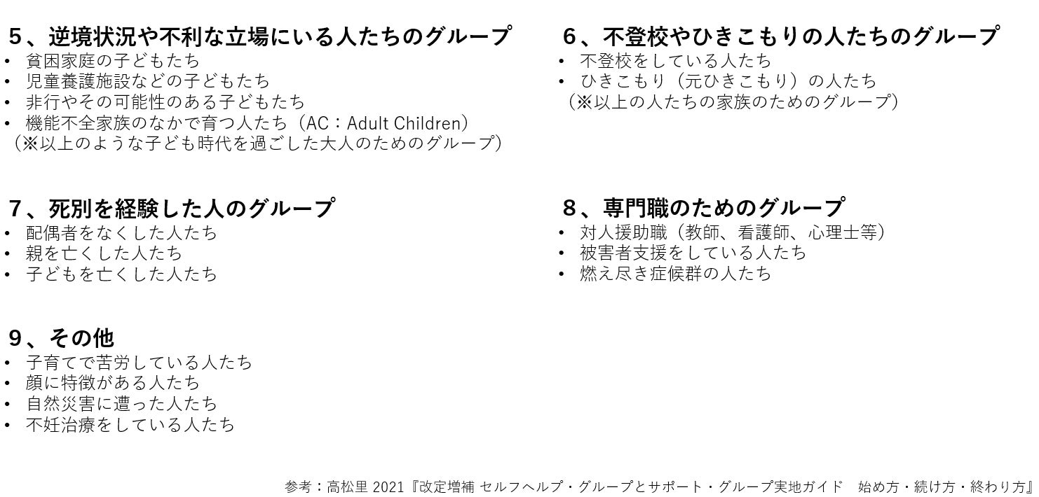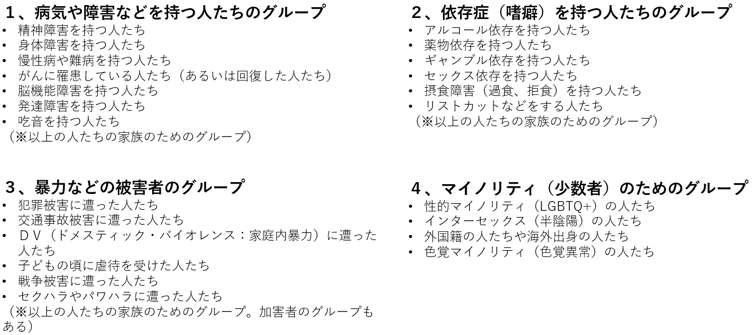 もしかしたら、プロジェクトをご覧いただいている方のなかにはご自身のこれまでの体験にあてはまるグループがあるかもしれません。なお、ここにあがっていないような、まだ社会的に認知されていない事柄をめぐるグループも存在します。