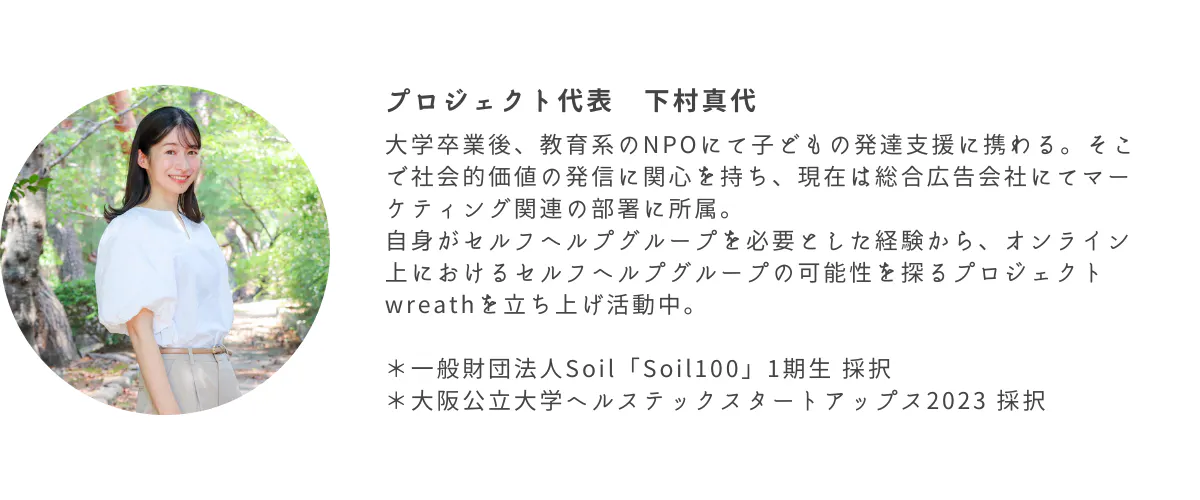 はじめまして!オンライン上におけるセルフヘルプグループの可能性を探るプロジェクト wreath代表の下村真代です。私自身がセルフヘルプグループを必要としそこから生きやすくなった経験から、セルフヘルプグループをもっと身近な存在にできたらと考え、プロジェクトを始動しました。