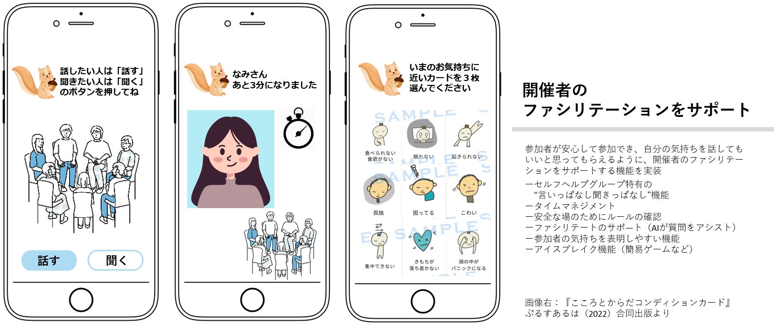 一方で、インタビューを通じて現状のオンラインツールではミーティングのファシリテーションに困難を感じておられる話を聞かせていただきました。そこで、開催者のファシリテーションをサポートする機能を実装したセルフヘルプグループに特化したオンライン通話ツールの開発の検討を行いたいと思っています。現状のイメージは下記の通りです。