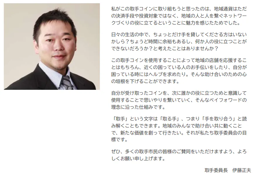 そして、地方での豊かな営みを支える‟インフラ”としての地域通貨に育っていけるよう、私としてもできる限りのことで尽力する所存ですので、皆さんからの温かいご支援を賜りますようよろしくお願い申し上げます。