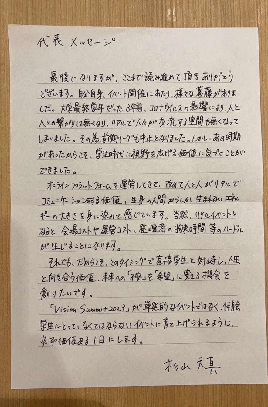 初めまして。『Vision Summit 2023』の企画&全体統括の杉山天真です。この度は、数あるプロジェクトの中から、本ページにご訪問頂きありがとうございます。