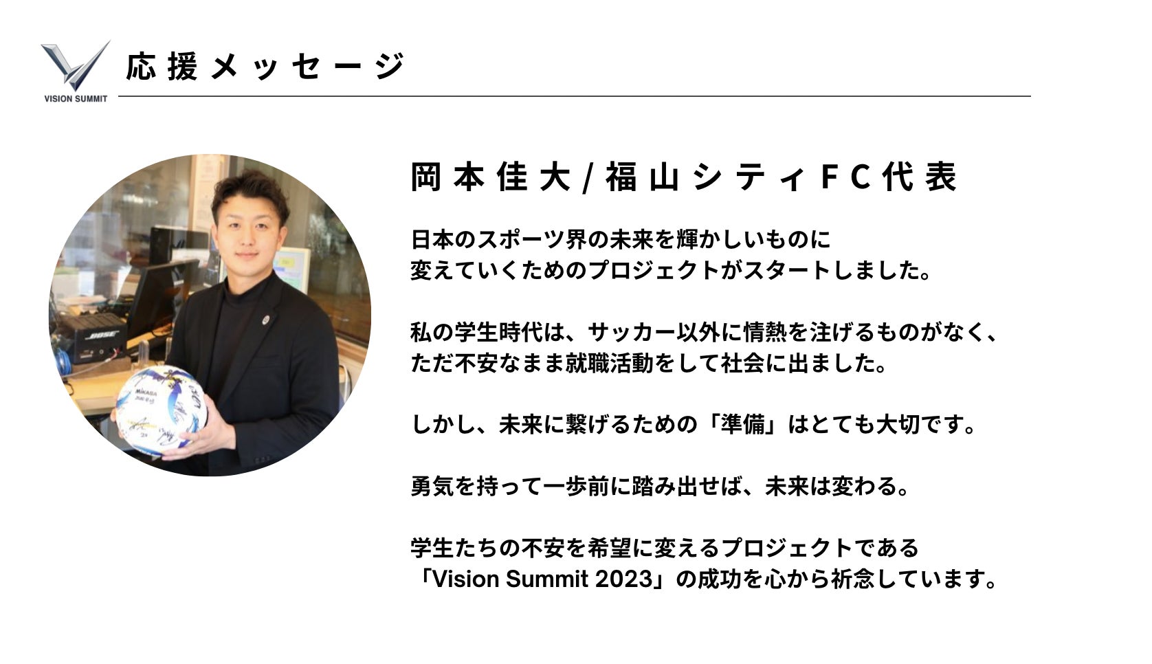 全国の競技に打ち込む体育会学生にとって、未来の一手となるようなイベント『Vision Summit 2023』を1000名規模で達成したいと思います。