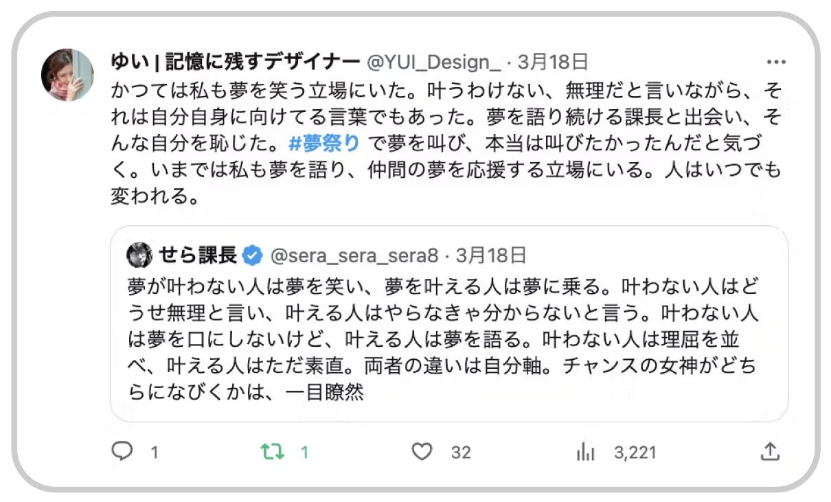 それからたくさんの夢をSNSに投稿し、行動をやめませんでした。