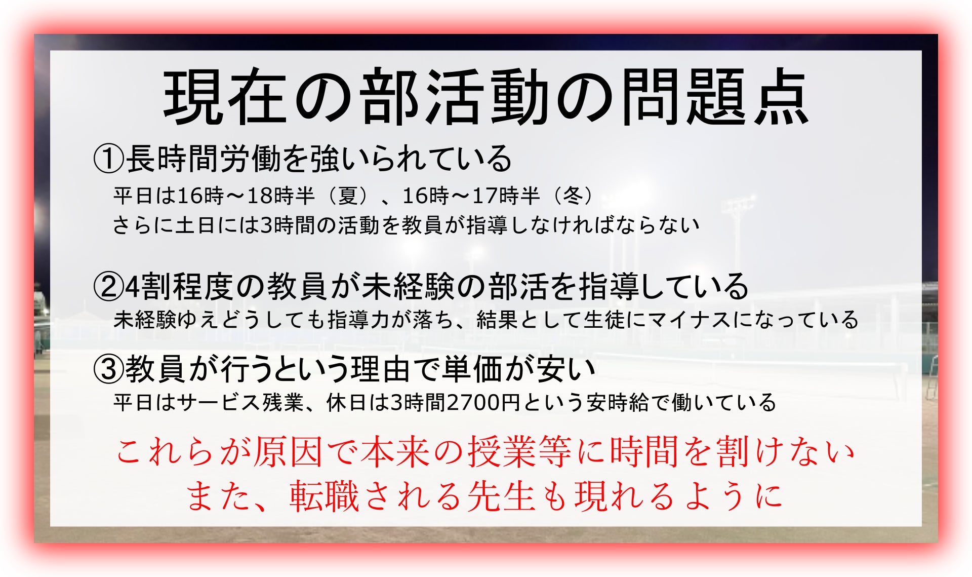しかし、現在の部活動は教員のサービスにより提供されているものであり、この実態を変えることこそが生徒にとってよりよい部活動を実現でき、現在の教員の過酷な労働環境を改善することができる手段だと確信しています!