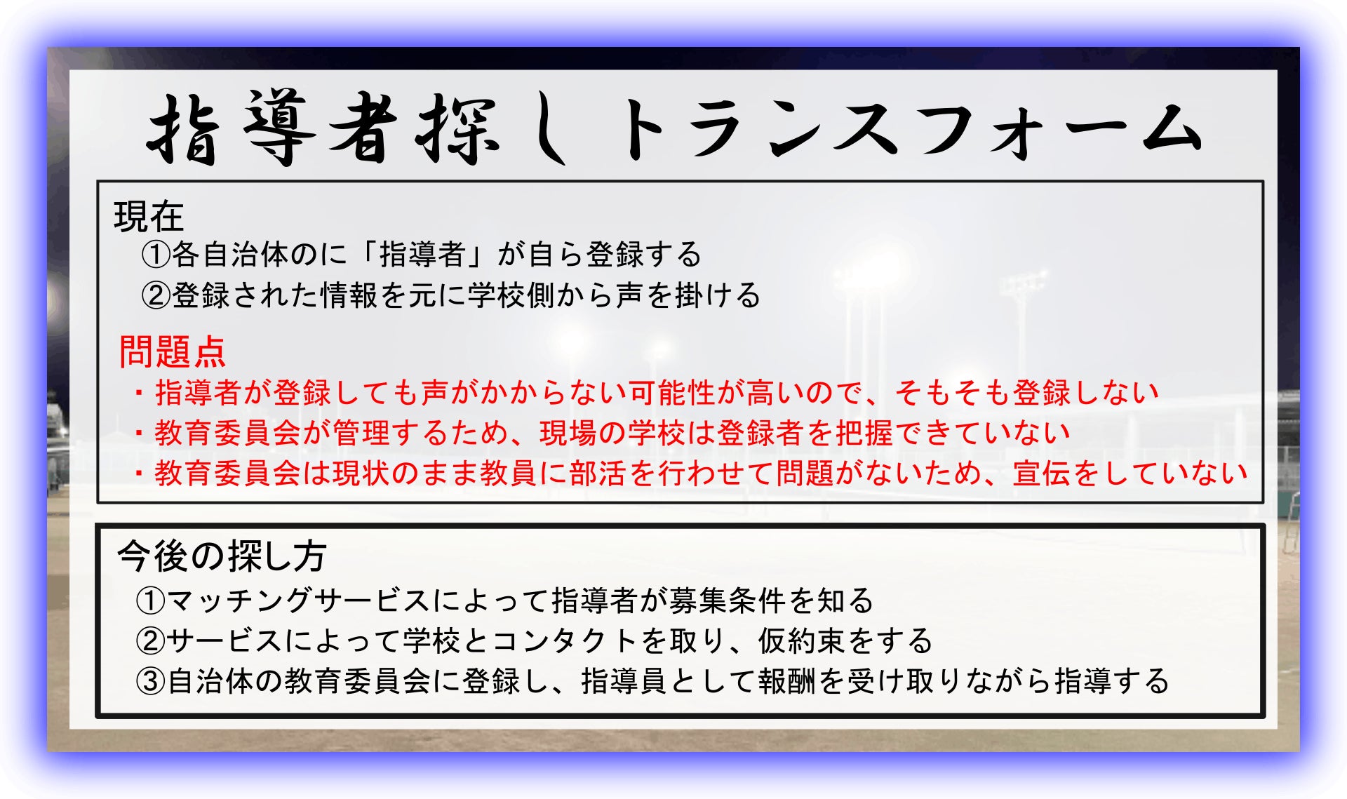 この問題を解決し、スピーディーに外部の指導者を探せる仕組みを構築することで、国や自治体が教員の労働改善のために出してくれているお金をうまく配分できるようになります。この仕組みがうまくいけば、部活動に関する予算も増えさらに部活動が充実したものになると信じています。