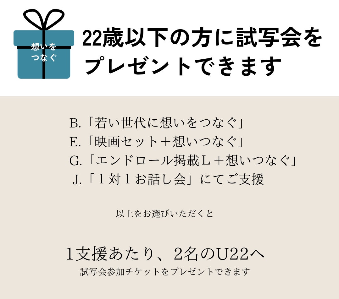 このプロジェクトには、22歳以下の方に、試写会のチケットを贈れるリターンがあります!