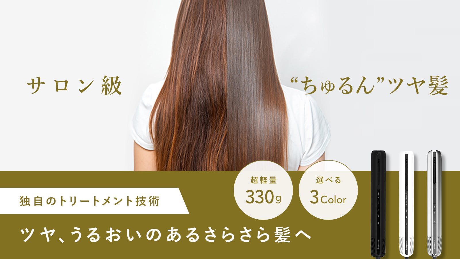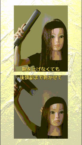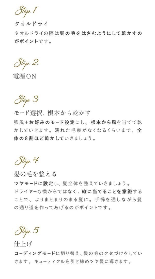 髪をボリュームダウンさせるには、毛流れと同じ方向に手ぐしを通し、上から下に温風をあててください。