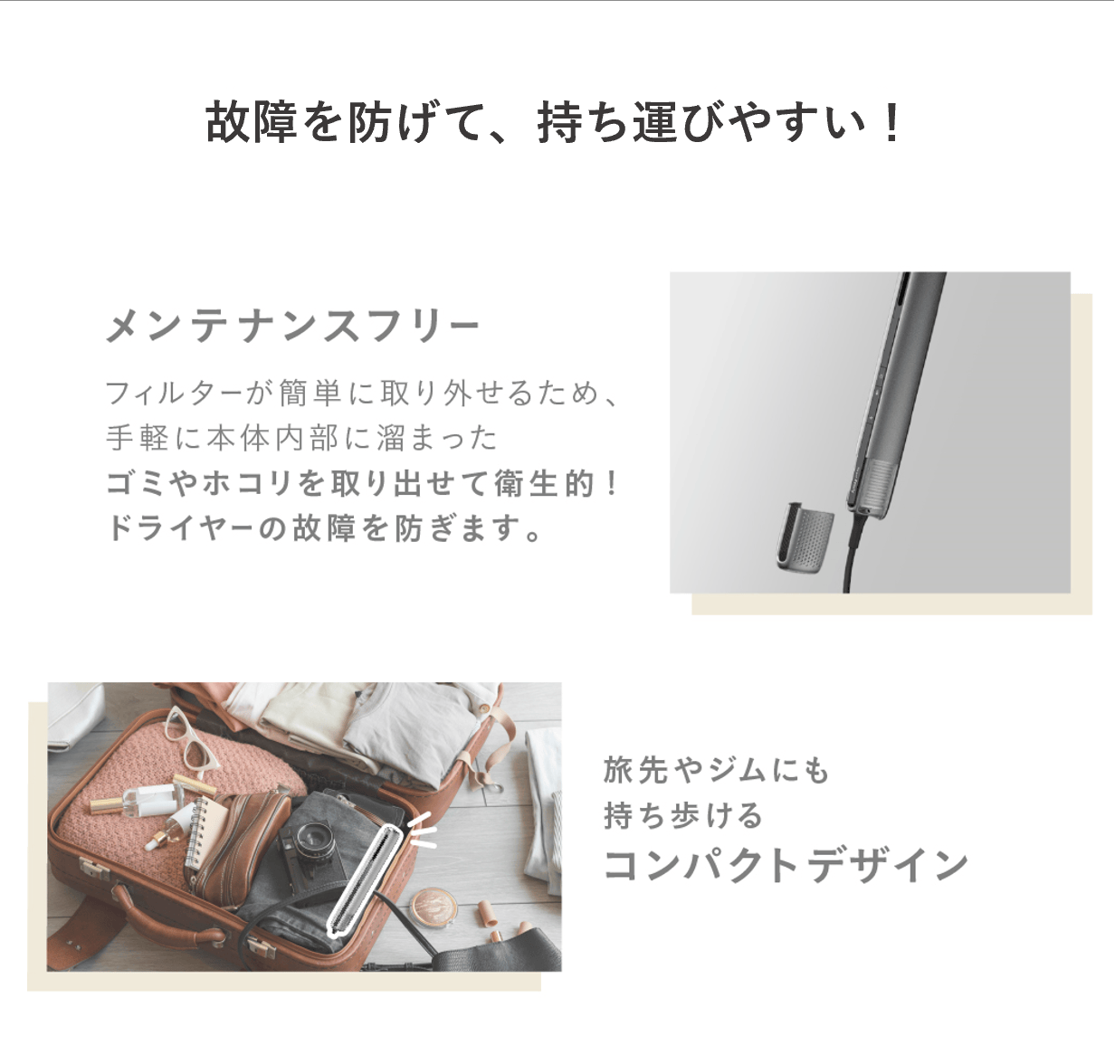 A.使用中、停止中に関わらず、カラカラ音がする場合は、ドライヤー内部に異物が入り込んでいる可能性があります。