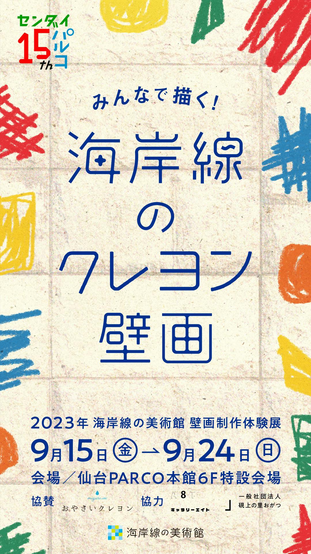 2023/09/15 17:28本日9月15日(金)より仙台パルコ6階特設会場にて、壁画制作体験展『みんなで描く!海岸線のクレヨン壁画』を開催します!仙台パルコ6Fのブースに出現するカベ。海岸線の美術館の制作を追体験できる展覧会となっております!カラフルにたのしく彩りましょう!三陸のリアス式海岸沿いにある、雄勝町の美しい海。 すいすい泳ぐさかなたち。すくすく育つホタテ、カキ、ワカメやウニ。 ぷかぷか船が浮かんでいるかも。防潮提の向こうにある美しい風景を想像しながら、クレヨンで海の壁画を描いてみよう!協賛: mizuiro.inc協力: galleryA8T / 一般社団法人硯上の里おがつ使用する画材は小さなお子様も安心して遊べるよう、お米と野菜から作られた『おやさいクレヨン』です。ご家族ご友人お誘い合わせの上あそびにいらしてくださいませ!また、仙台の卸町のGALLERY A8Tでは、安井鷹之介作品展示 移動壁画展『“IN THIS DAY AND AGE/現時代”』も開催中!こちらは、壁画制作アーティストの安井が雄勝町をリサーチする中で制作した、彫刻作品や平面作品を展示していたり、壁画の原寸大のスケールを感じるレプリカ作品が展示しています。雄勝町では絶賛壁画制作中なので、ぜひ3箇所合わせて見に来てもらえたら嬉しいです! もっと見る